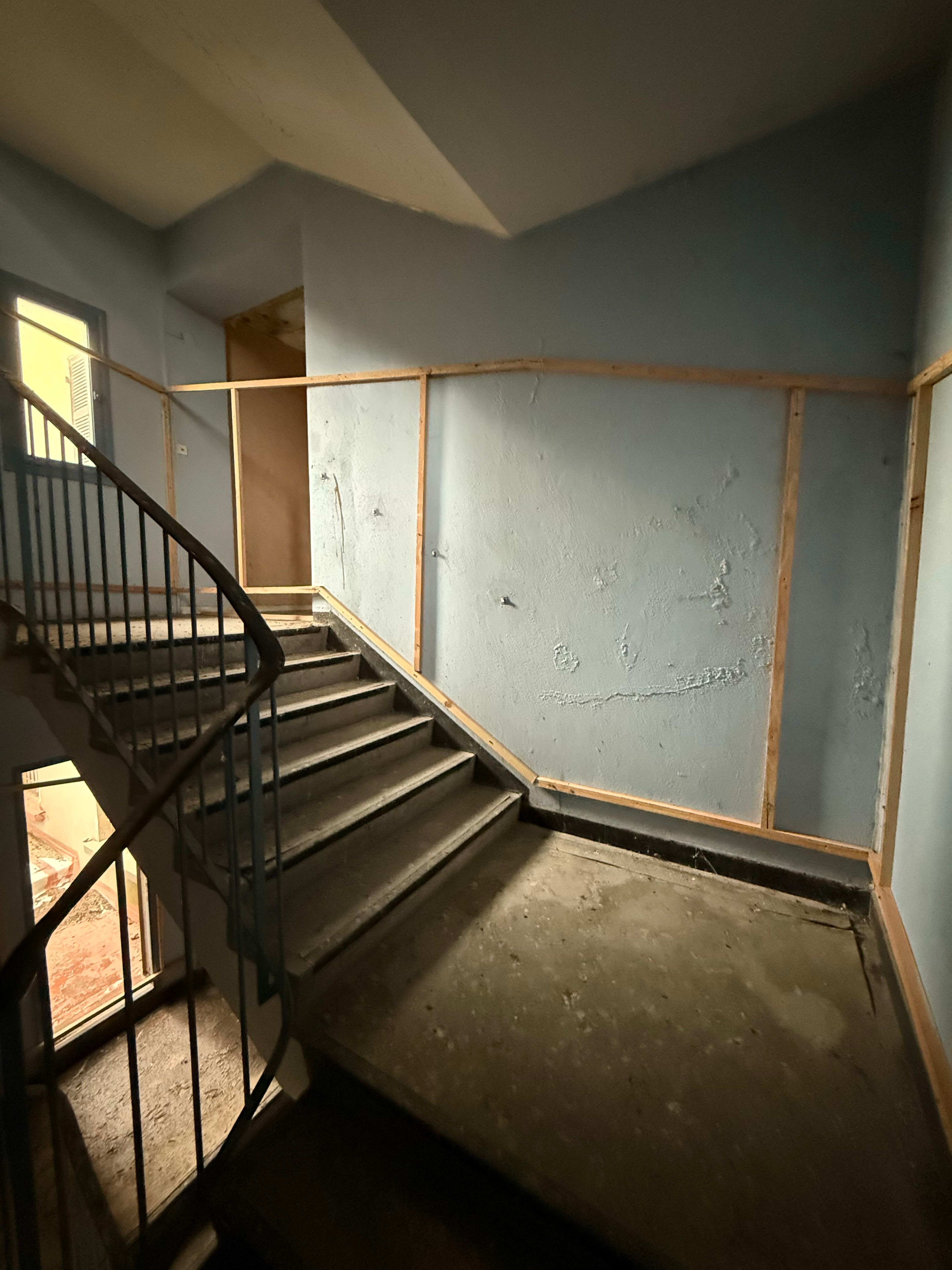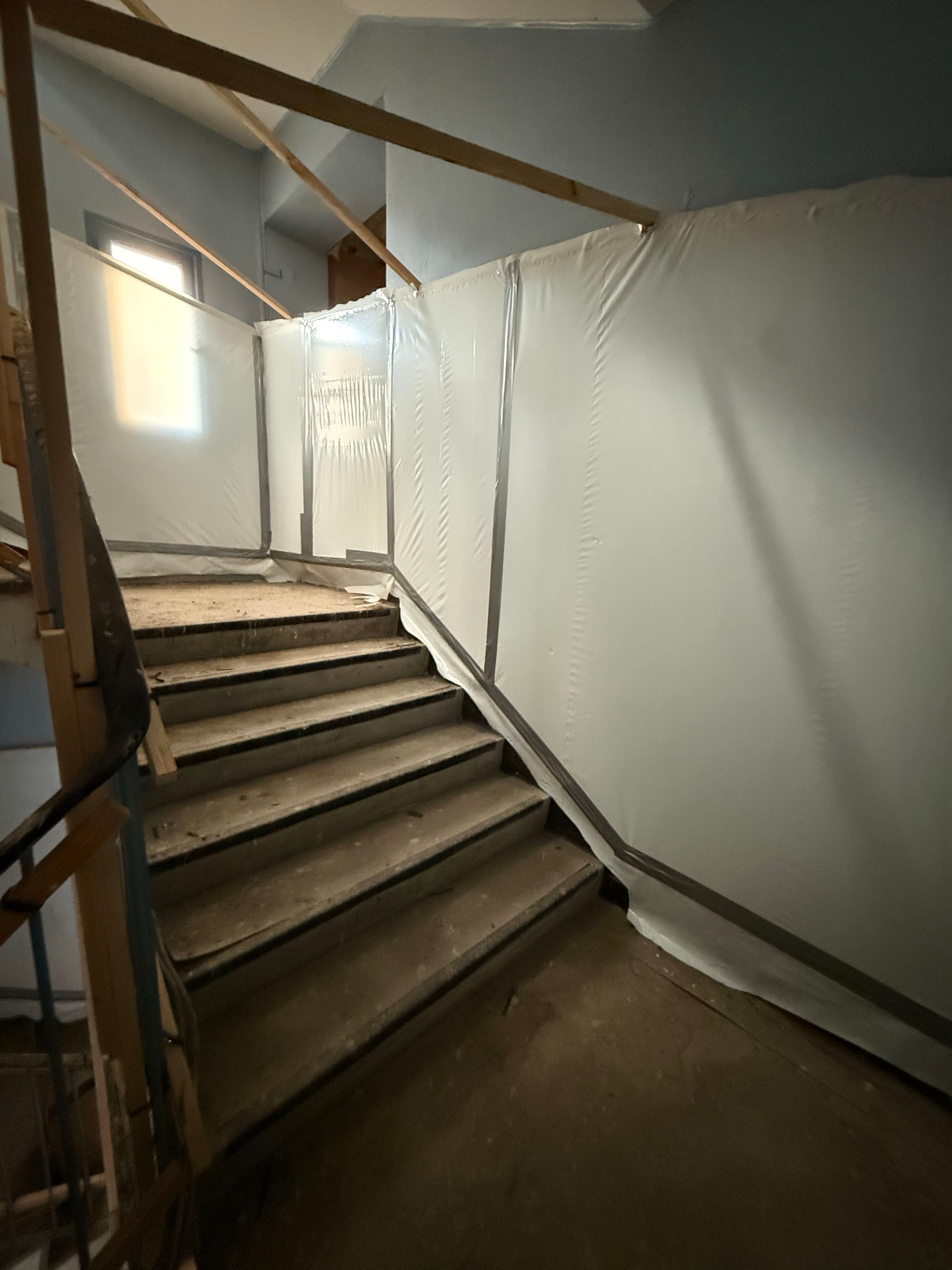 Dans le cadre de cette opération, nos équipes ont réalisé une phase de désamiantage comprenant notamment la dépose d’environ 80 m² de dalles de sol amiantées et de leur colle dans la cage d’escalier, du rez-de-chaussée jusqu’au R+3.